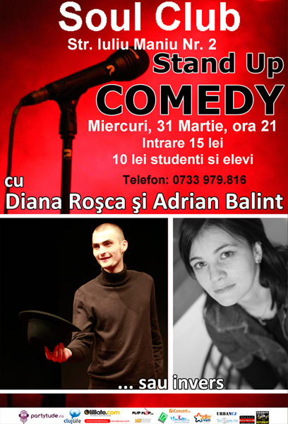 Miercuri, 31 martie 2010, ora 21:00, Soul Club din Cluj-Napoca ne invită la Stand-up Comedy cu Diana Rosca şi Adrian Balint.