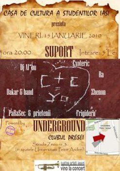 Vineri, 12 ianuarie 2010, ora 20:00, la Clubul Presei din Iasi va avea loc petrecerea Suport Underground.