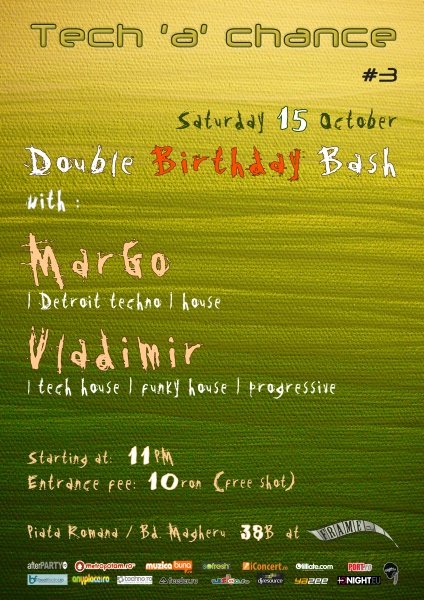 Sâmbătă, 15 octombrie 2011, de la ora 23:00, Frame Club din Bucureşti vă invită la Tech ‘a’ Chance, Double Birthday Bash.