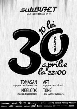 Vineri, 30 aprilie 2010, ora 22:00, Tomasan, VRT, Meeloox & Tone vor mixa la SubBufet din Bucureşti.