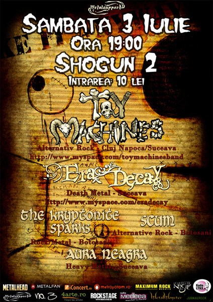 Sâmbătă, 3 iulie 2010, ora 19:00, trupele Toy Machines, Era Decay, The Kryptonite Sparks, Scum & Aura Neagra vor concerta la Club Shogun 2 din Botoşani.