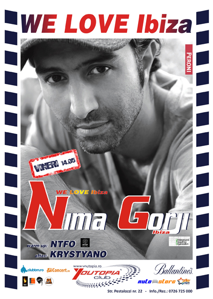 Vineri, 14 mai 2010, ora 23:00, în Club Youtopia din Timişoara are loc petrecerea „We Love Ibiza” cu Nima Gorji la platane.